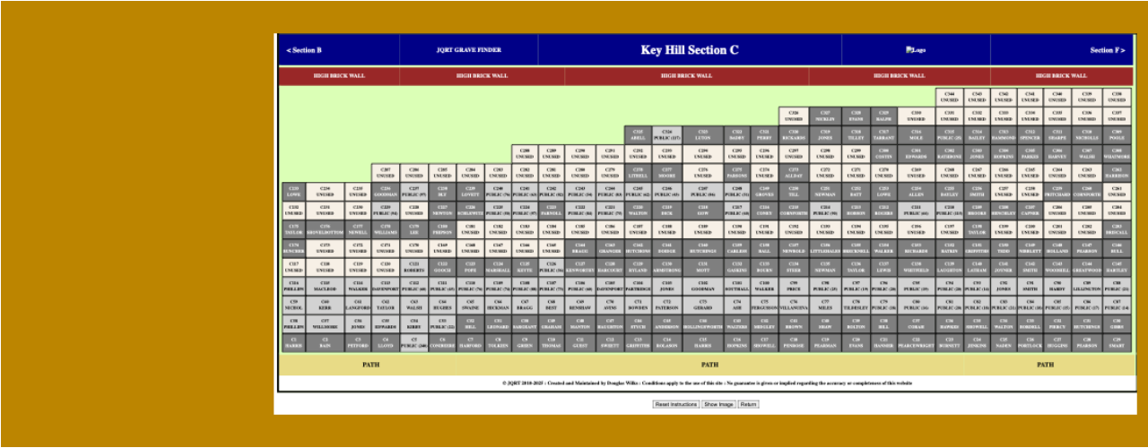 This is the main search page which enables you to search JQRT’s quarter of a million records. You can search by name, with initials, year of burial and sen you can also search graves by cemetery and grave section and number.